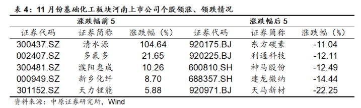 2025年11月,17家河南基础化工行业上市公司中,5家上涨,12家下跌,其中清水源、多氟多、濮阳惠成、新乡化纤和天力锂能(维权)表现居前,分别上涨104.64%、21.65%、10.26%、8.70%和5.88%,天马新材、建龙微纳、神马股份、利通科技和东方碳素表现居后,分别下跌22.25%、14.44%、12.49%、12.11%和11.04%。