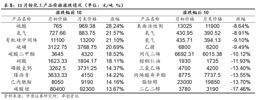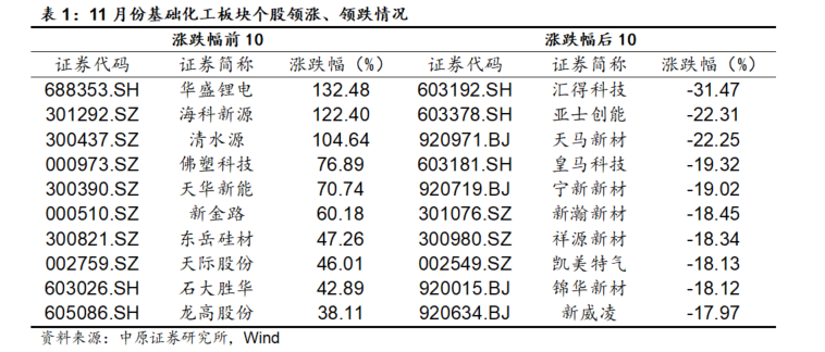 子行业及个股行情回顾: 根据Wind数据,2025年11月,33个中信三级子行业中,15个子行业上涨,18个子行业下跌。其中有机硅、氮肥、膜材料行业表现居前,分别上涨11.65%、8.85%和7.92%,改性塑料、锦纶、碳纤维行业表现居后,分别下跌6.84%、6.60%和6.00%。2025年11月,基础化工板块527只个股中,共有213支股票上涨,311支下跌。其中华盛锂电、海科新源、清水源(维权)、佛塑科技和天华新能位居涨幅榜前五,涨幅分别为132.48%、122.40%、104.64%、76.89%和70.74%;汇得科技、亚士创能、天马新材、皇马科技、宁新新材跌幅居前,分别下跌31.47%、22.31%、22.45%、19.32%和19.02%。
