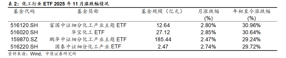 2025年11月,化工行业ETF全部上涨,其中鹏华中证细分化工产业主题ETF上涨2.47%。