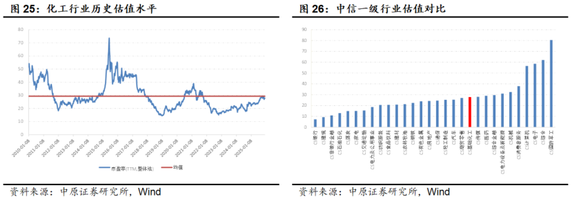 根据Wind数据,截止2025年12月11日,中信基础化工板块TTM市盈率(整体法,剔除负值)为27.76倍。2010年以来,行业估值平均水平为29.30倍,目前估值水平略低于历史平均水平。与其他中信一级行业横向对比,基础化工行业估值在30个行业中位居20位,维持行业“同步大市”的投资评级。12月份的投资策略,随着各行业反内卷整治的进一步深入以及稳增长措施的出台,化工行业供需格局有望进一步优化,建议两个维度寻找投资机会。