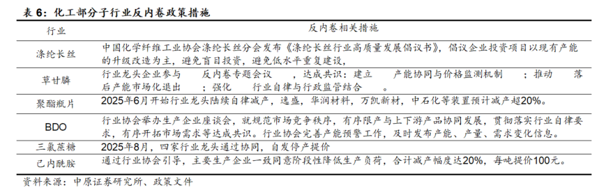 2024年以来,中央政治局会议、中央经济工作会议连续强调需“综合整治内卷式竞争”,2025年政府工作报告首次将“综合整治内卷式竞争”写入工作目标,反内卷治理不断深入。9月出台的《石化化工行业稳增长工作方案》明确提出了对传统产业新增产能进行管控。10 月底,新华社受权发布《中共中央关于制定国民经济和社会发展第十五个五年规划的建议》,其中综合整治“内卷式”竞争被正式写入。未来“反内卷”政策将上升为国家中长期发展战略,推动行业长期格局的改善。