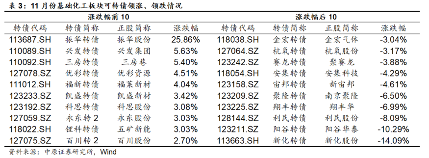 截至2025年12月10日,基础化工行业共有61只可转债标的。2025年11月,共有35支上涨,26支下跌,其中振华转债、兴发转债、三房转债、优彩转债、福新转债涨幅居前,分别上涨25.86%、5.63%、5.40%、4.51%和4.04%,新化转债、阳谷转债、利民转债、翔丰转债和聚隆转债跌幅居前,分别下跌14.09%、10.29%、8.09%、6.99%和6.50%。
