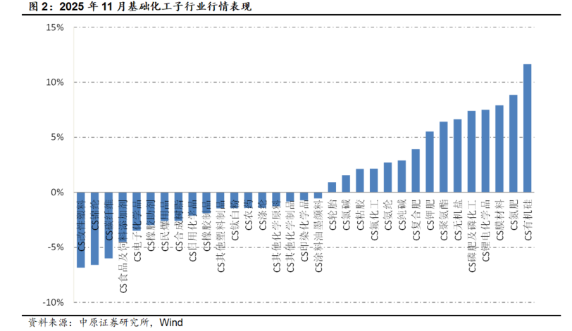 根据Wind数据,2025年11月,33个中信三级子行业中,15个子行业上涨,18个子行业下跌。其中有机硅、氮肥、膜材料行业表现居前,分别上涨11.65%、8.85%和7.92%,改性塑料、锦纶、碳纤维行业表现居后,分别下跌6.84%、6.60%和6.00%。