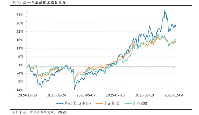 根据Wind数据,2025年11月中信基础化工行业指数上涨1.63%,跑赢上证综指3.31个百分点,跑赢沪深 300 指数4.09个百分点,行业整体表现在30个中信一级行业中排名第7位。最近一年来,中信基础化工指数上涨26.50%,跑赢上证综指9.60个百分点,跑赢沪深 300 指数10.92个百分点,表现在30个中信一级行业中排名第6位。