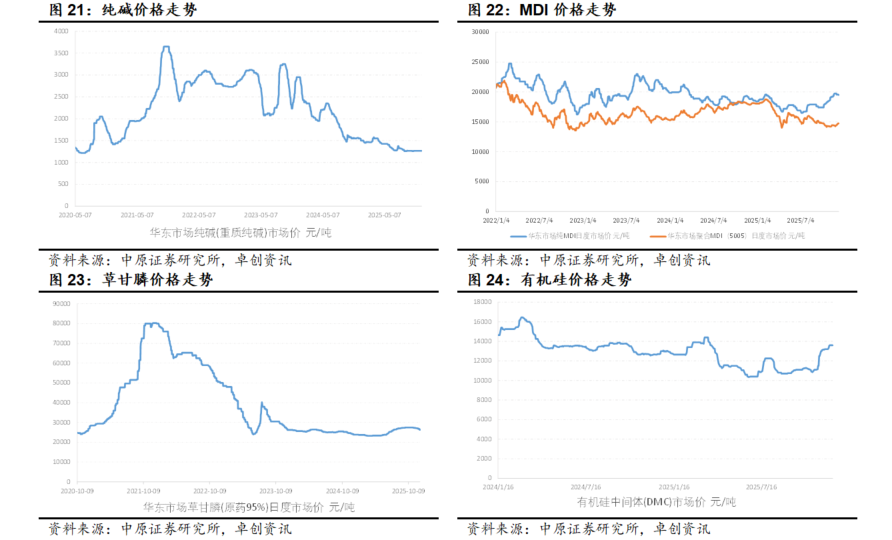 在化工领域,2025年9月印发的《石化化工行业稳增长工作方案(2025—2026年)》在确立行业平稳增长大方向和高质量发展目标的同时明确提出,对传统产业新增产能进行管控,包括加强重大石化、现代煤化工项目规划布局引导,严控新增炼油产能,科学调控乙烯、对二甲苯新增产能投放节奏,防范煤制甲醇行业产能过剩风险等。目前已有涤纶长丝、草甘膦、聚酯瓶片、三氯蔗糖、BDO、己内酰胺等多个子行业,通过行政法规监管、行业自律减产,行业协会引导等多方面落实反内卷相关措施。随着行业反内卷整治的进一步深入,化工行业部分领域产能过剩、无序过度竞争的现象有望缓解。