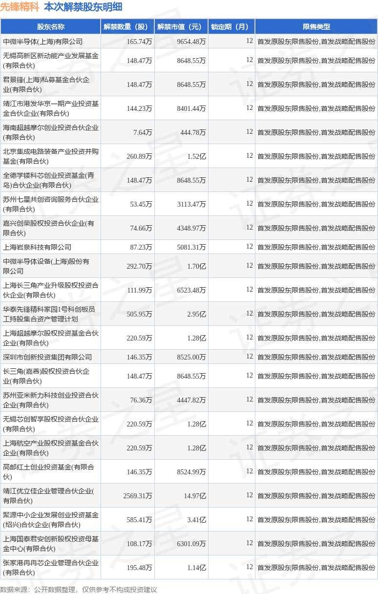证券之星消息,根据市场公开信息整理,先锋精科(688605)于12月12日将有6787.57万股限售股份解禁,为公司首发原股东限售股份,首发战略配售股份,占公司总股本33.54%。(本次数据根据历史公告整理得出,实际情况以上市公司最新公告为准)最近一年内,该股累计解禁243.09万股,占总股本的1.2%。本次解禁后,公司还有9402.81万股限售股份,占总股本46.46%。具体如下图所示: