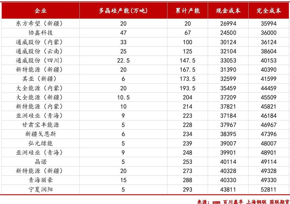 按企业计算,截止2024年,通威(超80万吨)、协鑫、东方希望、大全能源、新特能源等占据主要产能;其中,4.5万元/吨可覆盖近230万吨产能成本,5万元/吨则覆盖约300万吨。