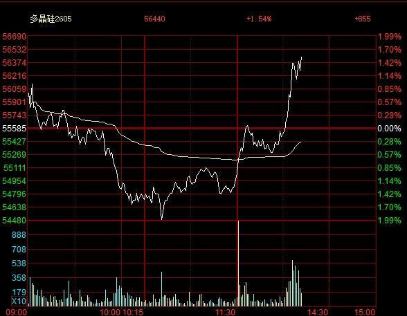午后媒体报道,光和谦成规划保留硅料产能不会超过150万吨。消息公布之后,多晶硅午后开盘迅速走高,盘中一度涨超1%,现报价56400元/吨。