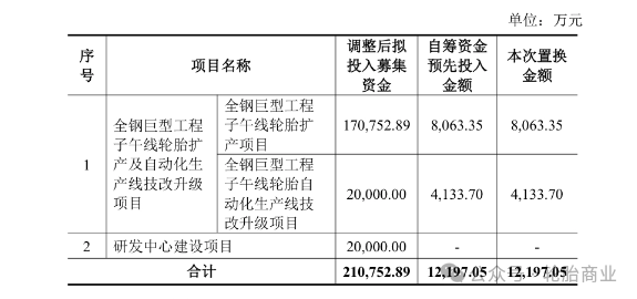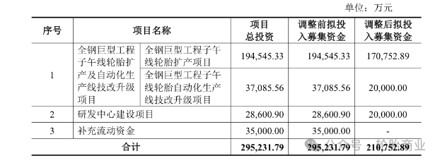 其中,“全钢巨型工程子午线轮胎扩产及自动化生产线技改升级项目”中“全钢巨型工程子午线轮胎扩产项目”募投金额从此前的19.45亿元缩减到17.08亿元;“全钢巨型工程子午线轮胎自动化生产线技改升级项目”从此前的3.71亿元缩减到2亿元。
