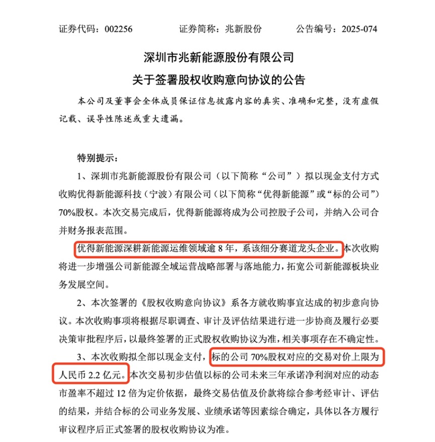 具体而言,兆新股份与优得新能源股东上海联之盛新能源科技集团有限公司、宁波联阅新能源有限公司、宁波迅飞企业管理咨询合伙企业(有限合伙)(以下合称“交易对方”)签署《股权收购意向协议》。公司拟以现金支付方式收购交易对方合计持有的优得新能源70%股权。本次交易尚处于筹划阶段,交易总价款尚未最终确定。