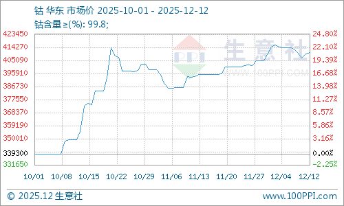 据生意社商品钴行情分析系统:12月12日钴价410620元/吨,较10月1日钴价339300元/吨大幅上涨,涨幅21.02%;较11月5日钴价385700元/吨震荡上涨,涨幅6.46%。刚果金引入出口配额制度之后,该国又新增了临时特许权使用费要求及复杂流程,让本就紧绷的钴供应链再添不确定性,国际市场钴供给预期短缺加剧,钴价大幅上涨。