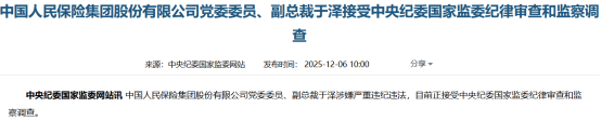 12月6日,据中央纪委国家监委网站消息,中国人民保险集团股份有限公司(以下简称“中国人保”)党委委员、副总裁于泽涉嫌严重违纪违法,目前正接受中央纪委国家监委纪律审查和监察调查。