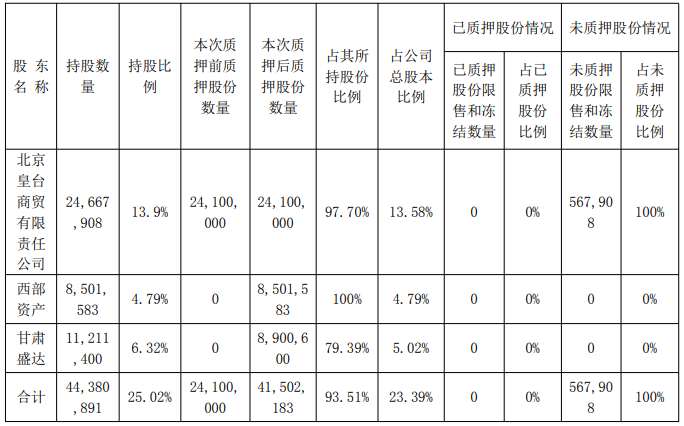 截至公告披露日,皇台酒业控股股东及一致行动人累计质押股份占其所持股份的93.51%,占公司总股本的23.39%。