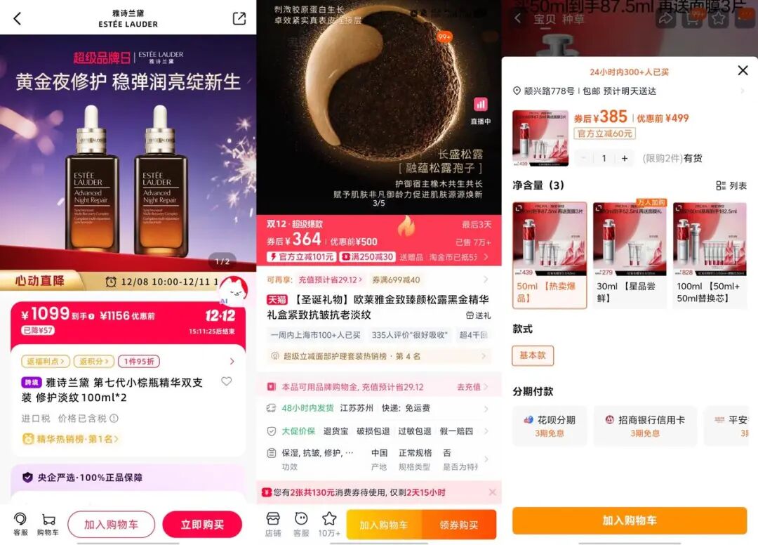 意识到国内消费降级的趋势,不少国际大牌开始通过部分渠道折扣、套盒组合优惠等方式变相降价,以此缓解市场压力。中免日上上,两支100ml的小棕瓶精华1099元;唯品会上一支100ml的小棕瓶精华429元;同为大众线的欧莱雅金致臻颜松露黑金精华抗老礼盒在淘宝旗舰店也才售卖364元。对比珀莱雅红宝石精华385元买50ml到手87.5ml的价格。这些国际大牌的终端售价与珀莱雅相比并无明显溢价,部分渠道的优惠力度甚至更具吸引力。