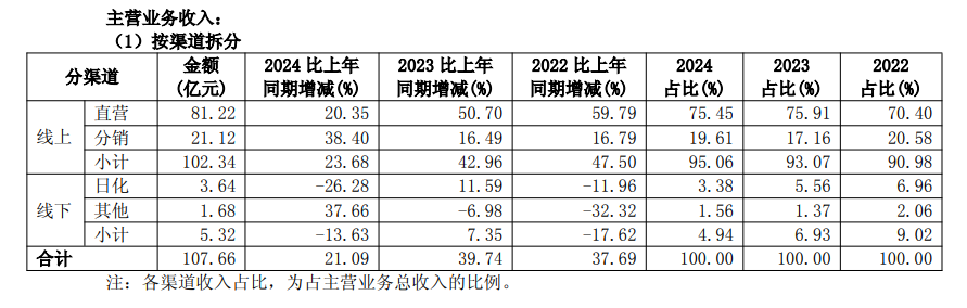 在全渠道运营已成为美妆行业共识的当下,珀莱雅却呈现出对线上渠道愈发严重的路径依赖。财报数据显示,2024年,珀莱雅线上渠道占比超95%。