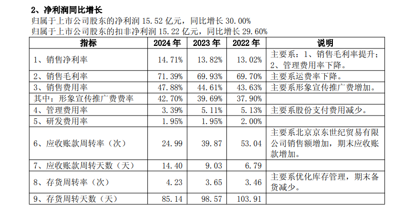 另一方面,依赖头部电商平台导致公司应收账款激增及回款速度变慢。2024 年珀莱雅应收账款周转率为 24.99 次,明显低于2023年的39.87 次、2022年的53.04次。2024 年期末应收账款金额5.18亿元,同比增长50.32%,其中对京东的应收账款期末余额为4.99 亿元,占整体应收账款的比例超96%。
