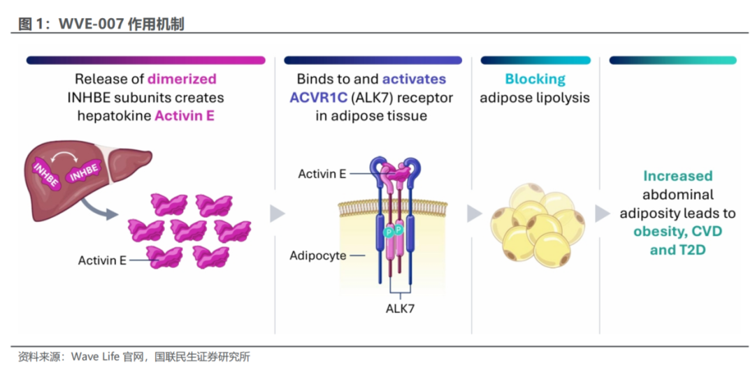 WVE-007(INHBE GalNAc-siRNA),该分子旨在通过沉默INHBE mRNA从而促进脂肪分解,同时不会抑制食欲和导致相应肌肉流失。INHBE以二聚体形式存在于肝脏中,当二聚化INHBE亚基被释放后会形成具有生物活性的肝细胞因子Activin E,其通过作用于脂肪组织最终引发腹部脂肪堆积、进而导致肥胖。