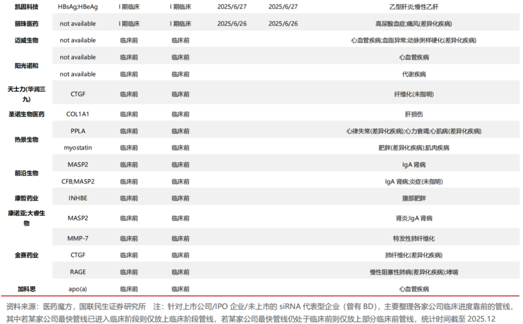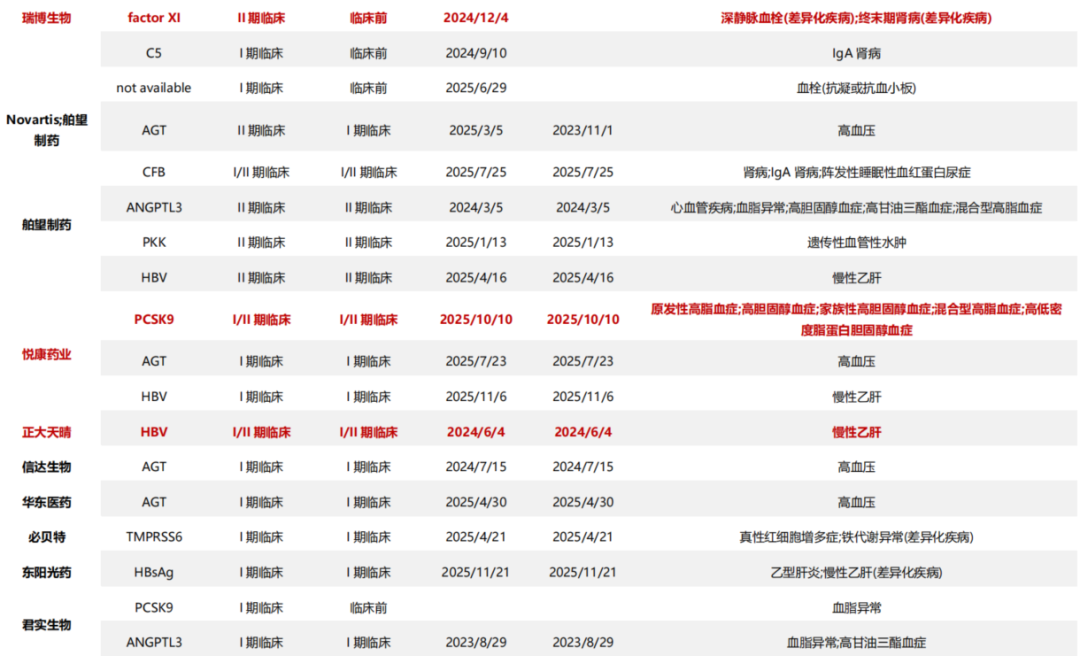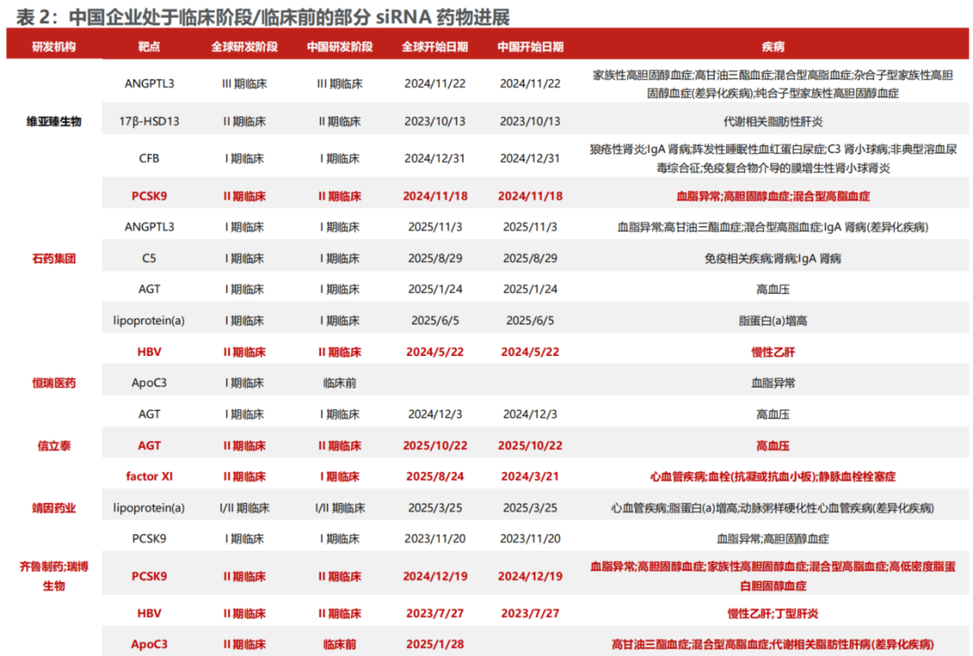 其他催化,1)海外代表型siRNA企业Arrowhead ARO-DIMER-PA(PCSK9/APOC3双靶RNAi)将于2026H2公布首次临床试验结果(1/2期),此外还会针对肥胖、CNS等品种持续给药。2)资本加强认可,中国siRNA代表型药企瑞博生物,2025.4首次提交IPO招股书,2025.10再次递交IPO招股书,上市时间可期。