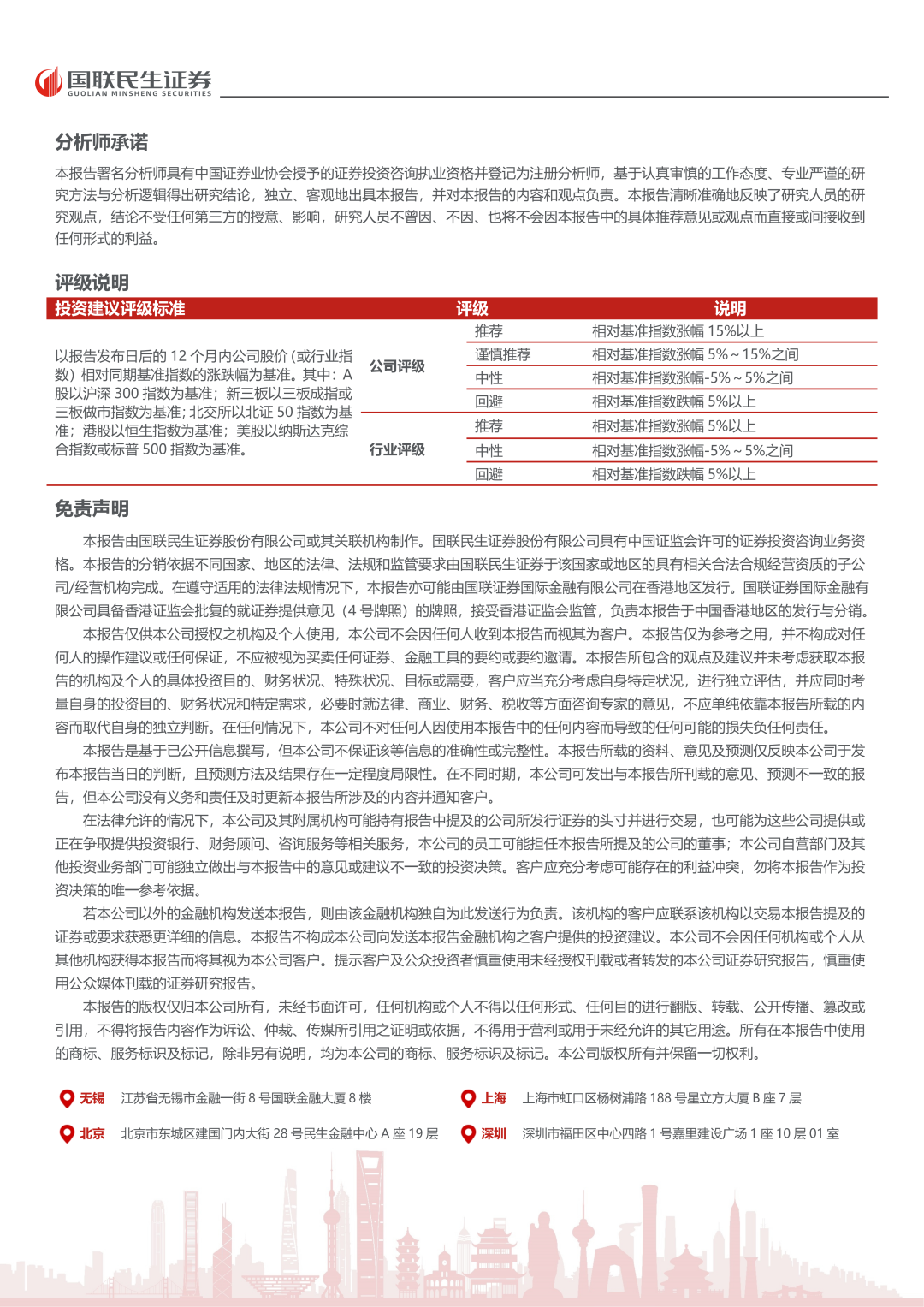 本平台及国联民生证券研究报告所载资料的来源及观点的出处皆被国联民生证券认为可靠,但国联民生证券不对其可靠性、准确性、时效性或完整性做出任何保证。本平台推送内容仅反映国联民生证券研究人员于发出完整报告当日的判断,本平台所载的资料、意见及推测有可能因发布日后的各种因素变化而不再准确或失效,国联民生证券不承担更新不准确或过时的资料、意见及推测的义务,在对相关信息进行更新时亦不会另行通知。在任何情况下,本平台所载信息、意见不构成对任何人的投资建议,所述证券或金融工具买卖的出价或征价,评级、目标价、估值、盈利预测等分析判断亦不构成对具体证券或金融工具在具体价位、具体时点、具体市场表现的投资建议。本平台所包含的观点及建议并未考虑获取本平台包含信息的机构及个人的具体投资目的、财务状况、特殊状况、目标或需要,客户应当充分考虑自身特定状况,进行独立评估,并应同时考量自身的投资目的、财务状况和特定需求,必要时就法律、商业、财务、税收等方面咨询专家的意见,不应单纯依靠本报告所载的内容而取代自身的独立判断。在法律允许的情况下,国联民生证券及其关联方可能持有本平台推送内容中提及的公司所发行证券的头寸并进行交易,也可能为这些公司提供或正在争取提供投资银行、财务顾问、咨询服务等相关服务。客户应充分考虑可能存在的利益冲突,勿将本平台推送内容作为投资决策的唯一参考依据。对任何直接或间接使用本平台所载信息和内容或者据此进行投资所造成的任何一切后果或损失,国联民生证券及/或其关联人员均不承担任何形式的法律责任。