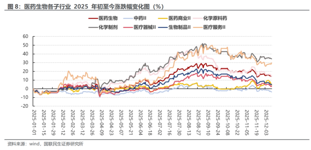 化学制剂年度涨跌幅行业内领先。2025年初至今表现最好的子行业为化学制剂,上涨34.44%;表现最差的为中药II,下跌3.54%。其他子行业中,医疗服务II较年初29.71%,医药生物较年初14.65%,化学原料药较年初14.47%,生物制品II较年初5.08%,医药商业II较年初4.60%,医疗器械II较年初3.25%。