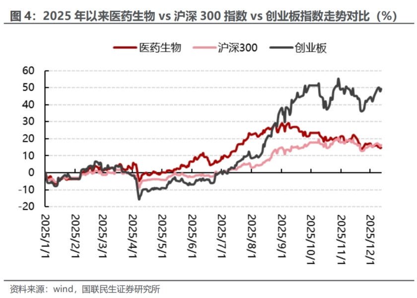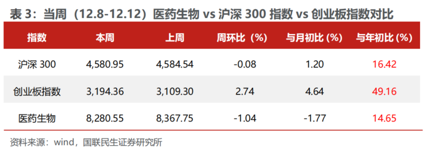 当周(12.8-12.12)医药生物指数环比-1.04%,跑输创业板指数,跑输沪深300指数。当周医药生物指数周环比-1.04%,沪深300 指数周环比-0.08%,创业板指数周环比+2.74%,医药跑输沪深300 指数0.96个百分点,跑输创业板指数3.78个百分点。2025 年初至今医药生物上涨14.65%,沪深300 上涨16.42%,创业板指数上涨49.16%,医药跑输沪深300 指数,跑输创业板指数。