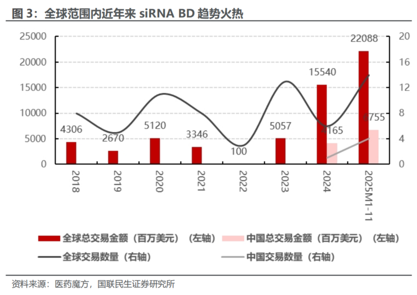 BD趋势向好,自siRNA商业化放量以来,其BD趋势不断向好,值得一提的是2024年1月、2025年9月,舶望制药就小核酸疗法同诺华分别达成41.65亿美元/53.6亿美元的交易总金额,这也代表着未来中国小核酸企业的技术路径,产品优势不断获得全球Top MNC的认可。