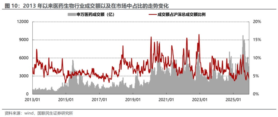 当周(12.8-12.12)医药行业热度较上一周上升。医药成交总额4233.54亿元,沪深总成交额为96884.23亿元,医药成交额占比沪深总成交额比例为4.38%(2013 年以来成交额均值为 7.13%)。