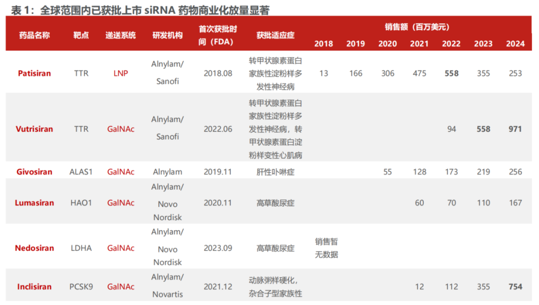 商业化增长可期,2021.12获FDA批准上市的Inclisiran,2022.6获FDA批准上市的Vutrisiran爬坡速度非常快,2024年销售额分别达到7.54亿美元/9.71亿美元,未来增长潜力十分可观。诺华制药针对其xRNA疗法的产品销售规模预测为300亿美元(仅4款药物),小核酸疗法未来放量潜力巨大。