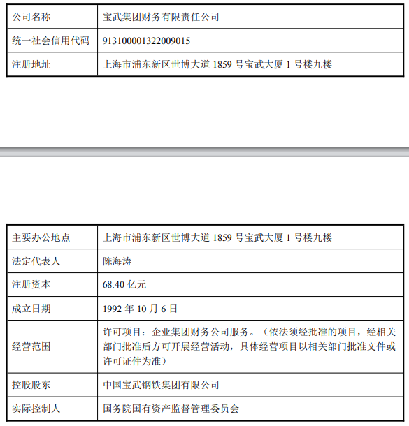 宝武财务有限责任公司前身为宝钢集团财务有限责任公司,成立于1992年6月,是经监管部门批准成立的全国性非银行金融机构。2020 年经监管机构批准,宝钢财务公司吸收合并武钢财务公司,并更名为宝武集团财务有限责任公司。经监管机构批准,宝武财务公司的业务范围涵盖支付结算、存贷款、票据贴现、即远期结售汇、委托贷款、固定收益类有价证券投资、非融资性保函、财务顾问等,可提供综合性、多元化金融解决方案。宝武财务公司最近一年及一期的主要财务数据如下: