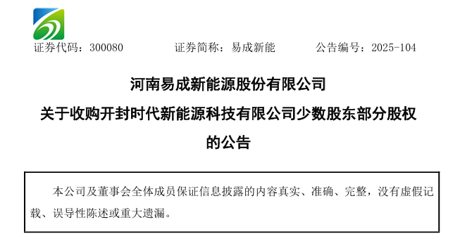 近日【光伏资讯】微信公众号(PV-info)了解到,12月11日,易成新能发布关于收购开封时代新能源科技有限公司少数股东部分股权的公告。
