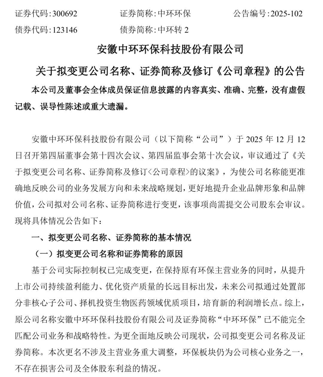12月14日,中环环保公告,公司于2025年12月12日召开第四届董事会第十四次会议、第四届监事会第十次会议,审议通过了《关于拟变更公司名称、证券简称及修订<公司章程>的议案》。基于公司实际控制权已完成变更,在保持原有环保主营业务的同时,未来公司拟通过处置部分非核心子公司、择机投资生物医药领域优质项目,培育新的利润增长点。原公司名称安徽中环环保科技股份有限公司及证券简称“中环环保”已不能完全匹配公司业务和战略特性。为更全面地反映公司现状,公司拟变更中文名称为安徽中赋源创科技集团股份有限公司,证券简称为中赋科技,证券代码300692保持不变。本次更名不涉及主营业务重大调整,环保板块仍为公司核心业务之一。