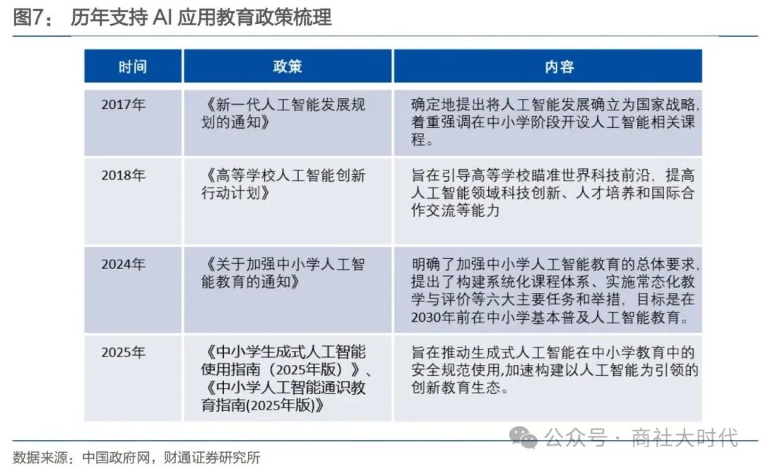 AI教育:AI关联场景加速商业化,政策发文鼓励+产业端密集催化。2025年5月,教育部基础教育教学指导委员会正式发布《中小学生成式人工智能使用指南(2025年版)》、《中小学人工智能通识教育指南(2025年版)》,旨在推动生成式人工智能在中小学教育中的安全规范使用,加速构建以人工智能为引领的创新教育生态。上市公司层面加快AI产品落地,今年3月,粉笔推出AI刷题班;6月24日,新东方发布2C英语产品“新东方AI一对一”,于7月2日正式上线,提供写作批改、互动问答等功能;天立国际天立成功推出首个实现校园教学规模化应用的AI大模型--“天立启鸣AI学伴”,并顺利通过“国家级”备案,并于6月30日举办AI产品发布会。7月8日,豆神教育(维权)推出AI新产品“AI Class”,旨在为学生打造定制化“AI超名师”。目前教育行业正在快速与AI大模型结合,关注落地场景跑通带来的增长机会。