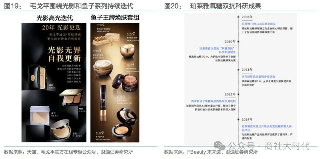 以史为鉴,头部国货美妆品牌持续打造穿越长周期的大单品。头部国货品牌通过贴合本土消费者的差异化创新,让大单品成为突破高端市场、实现品牌长效增长的核心抓手。(1)毛戈平围绕光感无痕粉膏开发配套系列(遮瑕、定妆、妆前乳、粉饼),形成“光影塑颜”完整解决方案,单款产品常年稳居天猫、抖音等平台修容类目TOP1;此外围绕“鱼子酱”核心原料构建抗衰“王牌焕肤套组”,形成全系列护肤产品连带,奢华鱼子家族围绕鱼子抗衰原料打造了包含精华、菁华水、面膜、精华、眼霜、面霜等系列,打造全系列产品,核心原料相同且功效相近,形成有效协同连带。(2)珀莱雅押注“抗氧化+抗老”的功效护肤赛道,首创落地早C晚A核心单品,多次位列天猫抗老抗氧化精华榜单前列,核心精华延伸至眼霜(双抗小夜灯眼霜)、面霜(红宝石面霜3.0)、水、面膜等,2025年4月迭代全新美白特证版双抗精华。