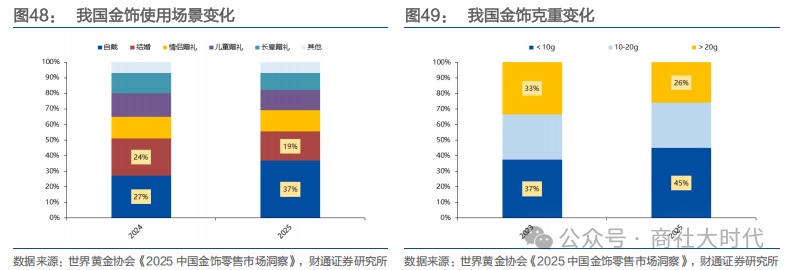 3)购买力约束下的选择,轻量化产品占主流。在金价大幅上涨但消费者预算未同 步增加的背景下,选择轻量化产品成为平衡“拥有黄金”与“控制成本”的最优 解。据《2025 中国金饰零售市场洞察》,2025 上半年 10 克以内黄金产品占比 45%,相较于 2023 年 37%显著增长。