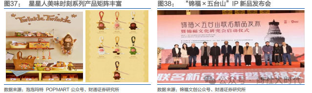 创源股份:“国潮 IP+祈福 IP”双赛道破局,打造多元 IP文创生态。创源股份在潮玩赛道明确“国潮IP+祈福IP”双赛道布局,搭建从IP产品消费到文化价 值输出的文创传递平台;国潮赛道立足国潮年轻化消费,祈福赛道方面公司于2025年1 月推出“锦福×五台山”联名,形态涵盖八大守护神手绳、灵运白塔旋转冰箱贴等系列,既保留五台山文化内核,又赋予场景化适配设计。公司后续有望与更多景区达成合作,扩大信仰文创影响力,形成双赛道IP文创协同发展的多元品牌矩阵。