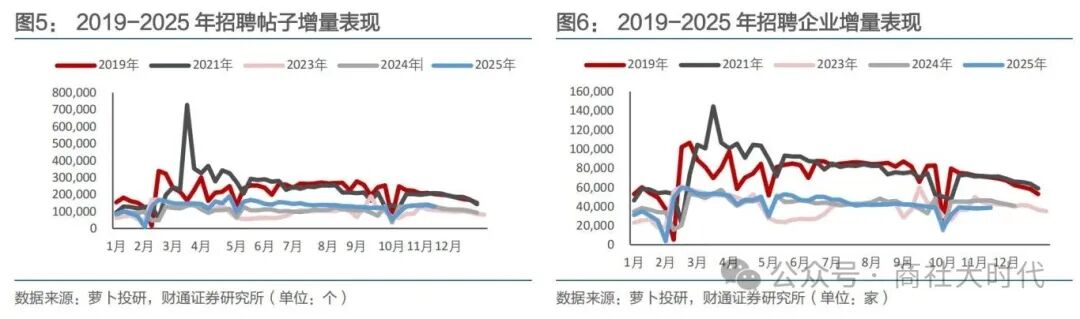 招聘行业向复苏演绎,节奏温和。招聘行业从年初至今呈现温和复苏态势,年初至今新增招聘企业数量恢复至2021/2023/2024年的54%/108%/101%,企业新增招聘帖数量恢复至2021/2023/2024年的56%/129%/123%。整体来看,今年的招聘行业较2023年和2024年有所恢复,但是相较于2021年仍有较大的恢复空间。我们认为,招聘行业总体向着复苏态势演绎,但是节奏相对温和,更应关注个股调整带来的α配置机会。