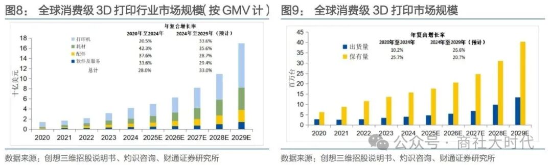 据PrecedenceResearch数据显示,2024年全球3D打印市场规模达246.1亿美元,未来十年CAGR预计为18.5%,消费级市场增速更快。据灼识咨询数据显示,按GMV来看,2024年全球消费级3D打印行业规模达41亿美元,未来五年CAGR预计为33.0%。按出货量来看,2024年全球消费级3D打印机出货量达15.8百万台,未来五年CAGR预计为26.6%。