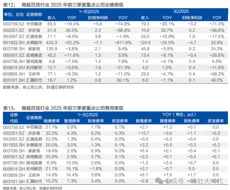 前三季度,商超百货板块收入和业绩端普遍承压,行业正经历结构性变革,头部 企业围绕供应链效率提升、门店空间重构、品类结构优化及数字化转型等维度推 进深度调改,后续调改成效有望逐步释放业绩潜力。叠加春节旺季即将来临,建议关注个股业绩兑现表现,两条主线布局:一是聚焦门店优化升级的永辉超市、步步高(维权)、汇嘉时代、新华百货等;二是发力会员店模式的武商集团、家家悦等, 把握细分赛道增长机遇。
