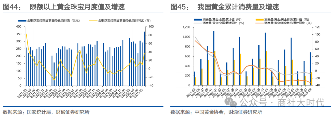 品类分化凸显,避险需求驱动投资类产品增长,高附加值首饰具韧性。据国家统 计局数据,10 月限额以上金银珠宝类零售额同比增长 37.6%,居商品品类首位; 1-10 月累计同比增长 14.0%,大幅跑赢社零整体 4.3%的增速。拆分结构看, 前三季度我国黄金消费总量 682.73 吨,同比下降 7.95%,其中黄金首饰消费同 比下降 32.50%,但小克重、高附加值产品具备结构性韧性;金条及金币消费同 比增长 24.55%,需求持续旺盛,主要源于地缘冲突加剧叠加经济不确定性上升, 黄金避险保值功能凸显推动投资类产品需求爆发。