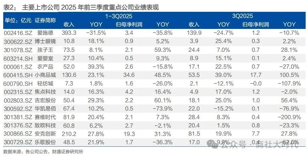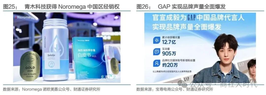 代运营厂商通过孵化自有品牌、拓展新品类等获取新增长。部分服务商开始从代运营向品牌化转型,通过沉淀运营经验、用户数据与供应链资源,打造自主可控的品牌矩阵。(1)若羽臣聚焦大健康和家清个护赛道布局,绽家双十一全渠道GMV增速超80%,在多个细分品类上表现突出;斐萃针对全年龄段女性人群在不同生命周期中的细分抗衰需求,二季度环比一季度高速增长。(2)青木科技围绕女性私护和保健品赛道布局,核心品牌珂蔓朵和Zucarri表现持续亮眼,公司11月公告2.12亿元收购Vitalis65.83%股权,并获得挪威高端膳食营养品牌Noromega中国区域总经销代理权,未来计划完善自有品牌矩阵化发展,未来有望构成30-50亿新消费品牌管理矩阵。(3)宝尊电商通过与GAP、Hunter、SweatyBetty等国际知名品牌的深度战略合作,尤其在GAP品牌合作逐步延伸至全链路、全场景,品牌端官宣新代言人重塑品牌年轻化改造,渠道端切入GAP线下门店运营,负责部分门店的选址、库存管理、数字化改造,均取得较好成效。
