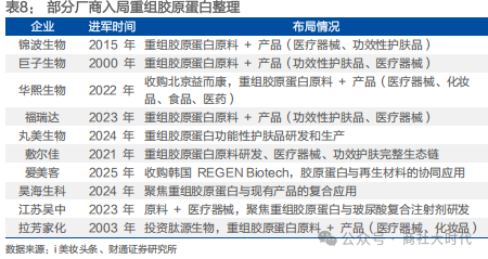 重组胶原蛋白材料:重组胶原蛋白作为新一代生物材料,因其生物相容性佳、免疫原性低等优势,正成为医美领域新焦点。继注射用重组胶原蛋白填充剂获得优先审批后,巨子生物10月获批重组I型α1亚型胶原蛋白冻干纤维,为国内首个天然序列重组I型胶原蛋白Ⅲ类医疗器械,核心适应症为纠正额部动力性皱纹,公司有望依托重组胶原蛋白分子库(含 33 种不同类型重组胶原蛋白)的技术积淀,推出“无交联残留”的重组胶原蛋白交联技术,强化在重组胶原蛋白领域的应用。此外,拉芳家化投资的肽源生物于2024 年10月完成注射用重组Ⅲ型人源化胶原蛋白冻干粉的Ⅲ类医疗器械临床测试,并于2024年12月向国家药监 局提交注册申请。