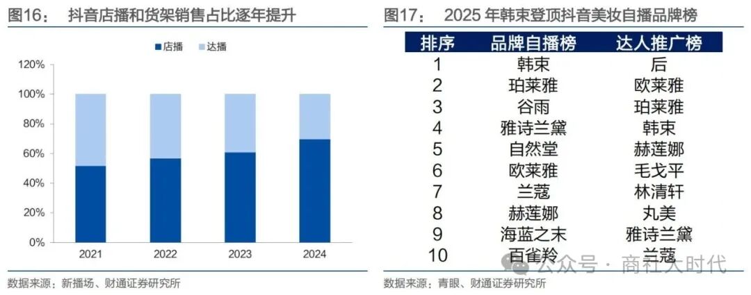 达播盈利承压中腰部补位,多矩阵营销模式成品牌破局关键。2025年来,高企的坑位费、趋于饱和的流量池叠加平台低价要求,且达播内容同质化严重,导致达播ROI下行、盈利难度激增,各大美妆品牌相继转型投放中腰部达人和搭建多样化的营销模式。聚美丽披露显示,国际大牌与头部国货对头部达人投放占比降至10%-30%,中腰部达播GMV、合作占比全面超越头部,规模年增超50%。以此次双十一为例,李佳琦美妆品类带货下滑10%左右,潘雨润、搭搭、韦雪等美妆垂类达人GMV表现不及预期。达播是利用达人的流量帮助品牌做转化,相较而言,自播运营难度更高,但其对优化利润、增强用户粘性和消费转化有较好帮助。电商平台头部品牌自播GMV已超越或持平部分达播,成为重要销售渠道。品牌为获取广泛且可持续的流量,一方面需提升自播运营能力以应对达播的成本与转化风险,另一方面需要搭建营销矩阵,结合达播、自播、短视频、代言等多种方式,同步实现高效转化与品牌破圈。如韩束通过搭建多个精细化自播间,叠加高频自播的模式,2025年初至11月17日登顶抖音美妆自播排名,其利润弹性在渠道结构调整下得到持续释放。在渠道趋势变化下,有广泛人群资产积累且渠道精细化运营能力突出的品牌有望率先抢占渠道红利。