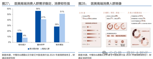 医美高端消费人群需求稳定、消费韧性强。分消费群体看,根据德勤&艾尔建的数据,2023年有92%的中高收入医美需求者维持或增加了医美消费金额,2023年医美高端消费人群(年支出超5万元)消费增加的比例较全部潜力消费者高出平均23个pct,表明高端用户的复购意愿更强,同时该群体收入较高、消费受经济波动的影响较小。可以看出,医美高端消费人群的需求更加稳定,预计对高端差异化医美产品的需求韧性也较为显著。
