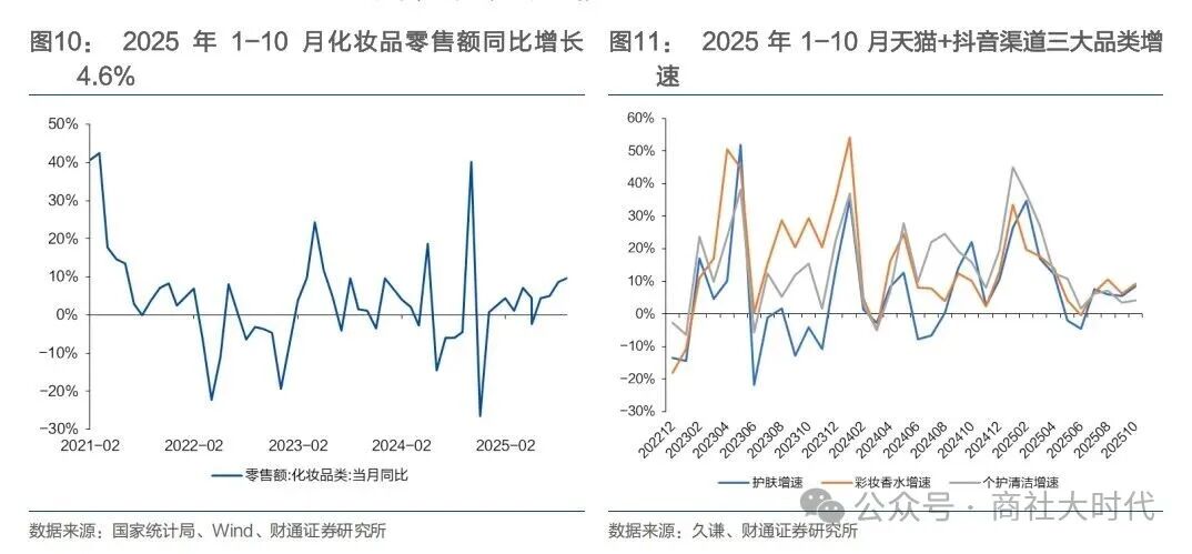 2025年化妆品行业预计保持稳健增长,抖音增速和份额均位居第一。2025年1-10月化妆品行业呈现稳健复苏态势,零售额累计达3813亿元,同比增长4.6%,消费零售额增速高于2024年同期。根据久谦数据,2025年1-10月天猫+抖音渠道护肤/彩妆香水/个护家清品类的销售额分别为1623/630/650亿元,同比分别+9.5%/+12.0%/+13.4%,其中抖音三大品类份额和增速均高于天猫平台,增速分别达+13.8%/+16.4%/+22.2%,个护家清在“需求刚性+体验升级”的双轮驱动下,线上渗透加速推进。