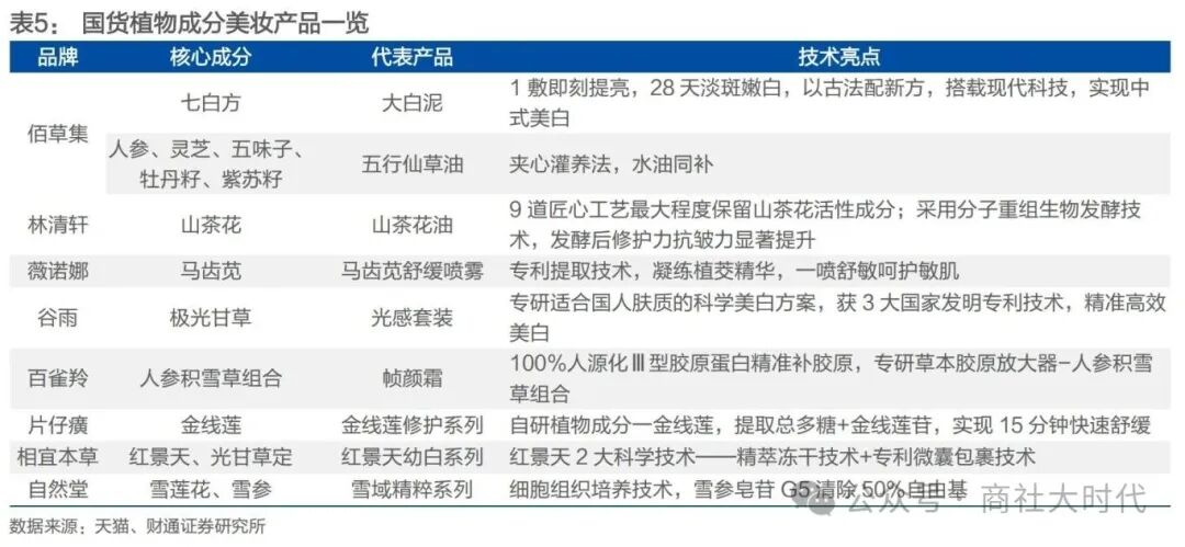 东方植萃焕活创新植物成分,国货美妆撬动护肤新篇。依托中国得天独厚的本土植物资源与前沿科技,国货美妆正掀起一场“东方植萃+科学护肤”的革命。《化妆品监督管理条例》规定:“鼓励和支持运用现代科学技术,结合我国传统优势项目和特色植物资源研究开发化妆品”,推动化妆品植物新原料备案量在近年呈现爆发式增长,从2021年的0款植物新原料备案,到2022-2024年分别达到3款、12款、38款,首次超过化学原料和生物技术原料,位居第一。我国拥有多品类的独特植物资源,草本护肤、温和调理也契合中国消费者的传统认知,支撑国货美妆从“成分、文化、供应链”三个维度构建差异化优势——佰草集以超声低温破壁技术焕活“新七白方”草本精粹,28天实现抑黑提亮双重功效;林清轩聚焦“以油养肤”赛道,核心单品山茶籽油自2014年来连续11年销售额位居全国精华油榜首,打造东方护肤标杆。依托中国本土资源禀赋的植物萃取活性成分,在现代生物提取等技术加持下,植物新原料正成为国货美妆品牌实现差异化竞争的底气。