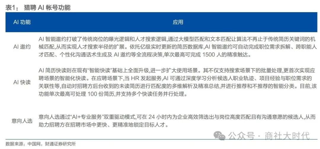 关注 AI 应用持续落地带来的行业效率变革及商业化机会。人力资源行业是AI应用较为通顺的场景之一,主要体现在提升效率以及商业化两方面。效率层面,人力资源行业是人力密集型行业,尤其是在处理人岗匹配环节,AI大模型的介入有助于极大提升匹配的精准度和效率,从而实现运营成本的优化。今年2月,科锐国际宣布接入DeepseekR1大模型,探索AI大模型与招聘特别是中高端招聘领域的深度融合,提升人才匹配效率;北京人力推出AI智能招聘等。从商业化来看,猎聘在今年3月将B端产品企业版正式升级为AI版本,面向企业推出全新AI账号产品。猎聘AI账号的核心产品矩阵目前主要包括智能邀约(AI邀约)、简历快读(AI快读)、意向人选等,旨在帮助B端企业决策者提升招聘效率。