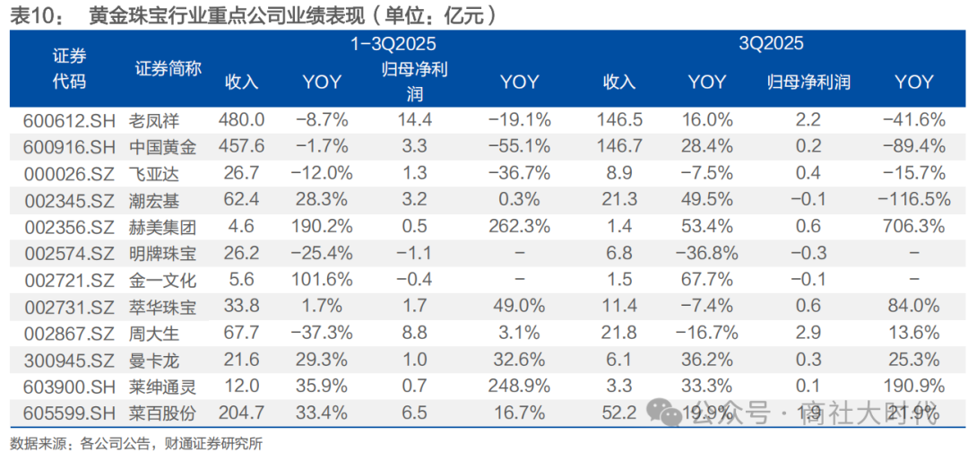 从三季度表现来看,以选取的样本公司为例,1-3Q2025,A 股黄金珠宝行业整 体实现收入 1403 亿元,yoy-1.9%;实现归母净利润 39.9 亿元,yoy-12.5%。 单季度看,Q3 行业整体实现收入 427.8 亿元,yoy+16.9%,实现归母净利润 8.5 亿元,yoy-22.5%。