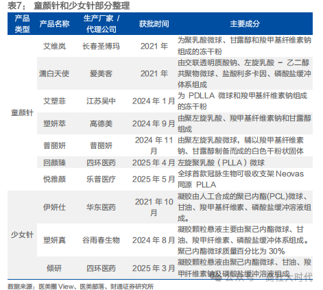 PDRN(三文鱼针):PDRN(多聚脱氧核糖核苷酸)提取自三文鱼(鲑鱼), 因其可通过与腺苷A2A受体结合,有效促进成纤维细胞增殖,加速胶原蛋白合成,从而达成抗炎、改善色素沉着、促进组织再生及强效抗衰老的多重功效。韩国、日本及部分欧盟国家已建立鲑鱼源PDRN在医美及非处方产品的审批先例。 在国内,华熙生物、江苏吴中、乐普医疗等逾20家企业已切入PDRN研发与生产领域,其中乐普医疗的PDRN水光针(三文鱼针)已完成临床前动物实验,计划于 2026 年一季度推出国内首款PDRN水光针,2026年销售目标 2 亿元,与童颜针、水光针等产品共同构建多元化医美产品矩阵。