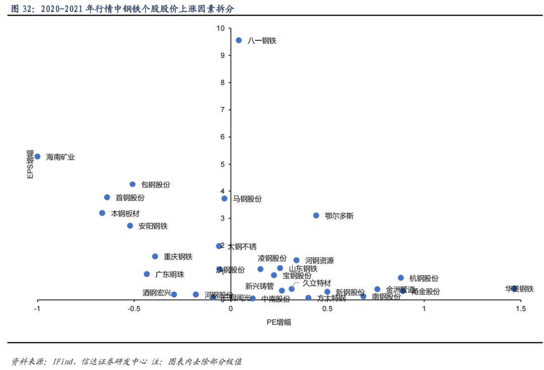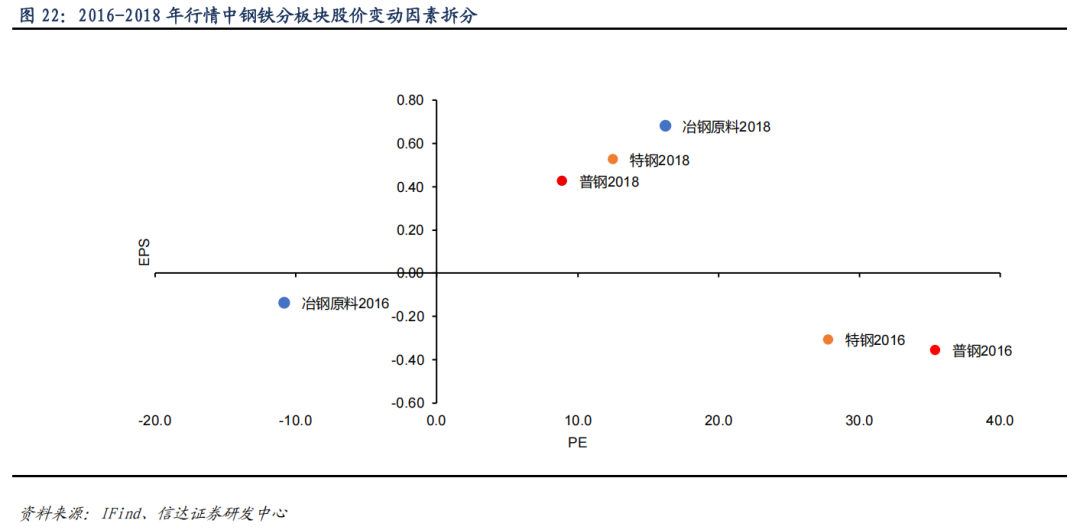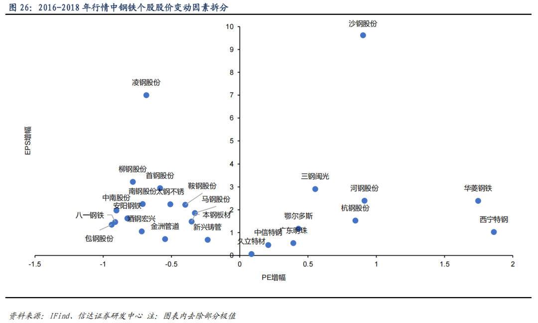 2016-2018 年行情中,股价上涨主要来自于业绩的增厚。股价变动因素拆分后,河钢资源、方大炭素、新钢股份、方大特钢、山东钢铁、宝钢股份、沙钢股份、凌钢股份 EPS 增幅均超过 5 倍(在下方图中已去除部分极值),其中河钢资源、方大炭素、新钢股份、方大特钢等股价涨幅均低于 EPS 涨幅。