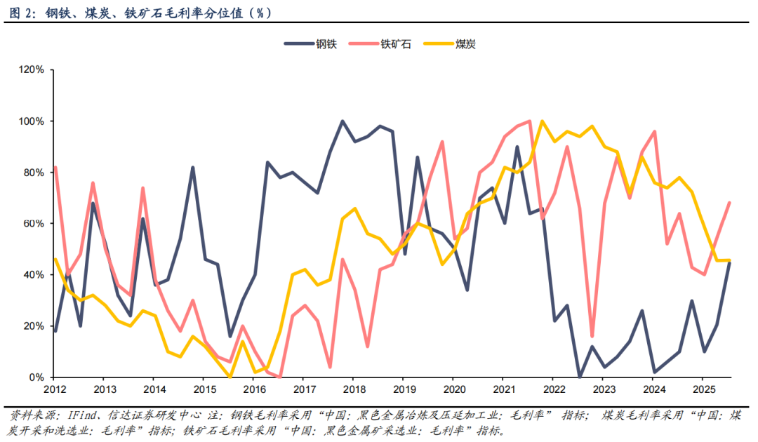 煤钢矿产业链格局松动,2025 年钢铁行业毛利率上行。2025 年第三季度,钢铁行业毛利率为 6.4%,是 2012 年以来 45%分位;煤炭行业毛利率为 26.5%,是 2012 年以来 46%分位,铁矿石毛利率为 20.3%,是 2012 年以来 68%分位。2025 年钢铁行业毛利率水平摆脱了 2022 年以来的底部震荡,而煤炭行业的毛利率水平则从 2023 年逐年下移。
